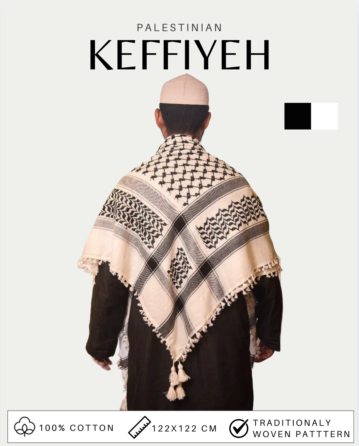 The Palestinian Keffiyeh, also known as Kufiya or Shemagh, is an iconic scarf with a rich history. This black-and-white design has been worn for generations and is recognized worldwide as a symbol of culture, identity, and solidarity.