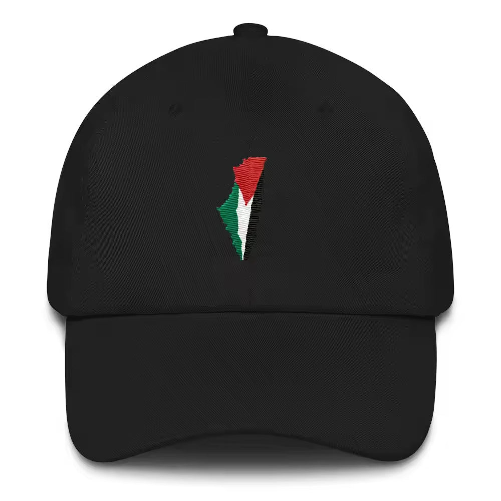 Boné preto com um mapa bordado da Palestina histórica nas cores da bandeira palestina. Um design subtil mas poderoso.